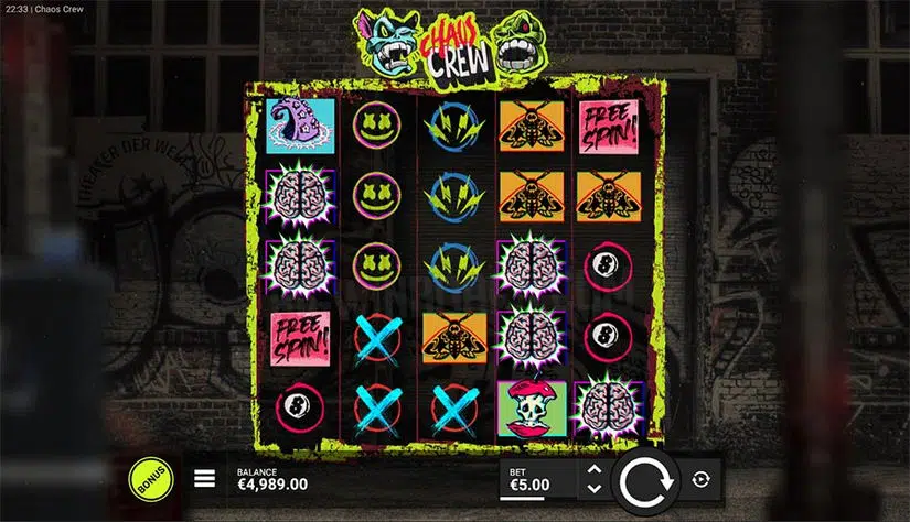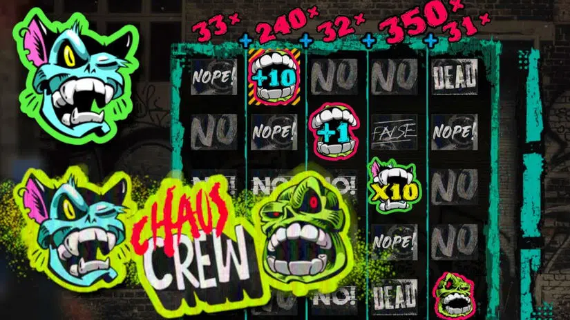 Delving into the key features of Chaos Crew reveals its appeal through engaging mechanics and high win potential. The free spins feature is triggered by landing three graffiti-style scatter symbols on the reels. This bonus round shifts to a new grid filled with non-paying symbols like “Dead,” “Nope,” and “False,” while introducing the Cranky Cat multipliers.