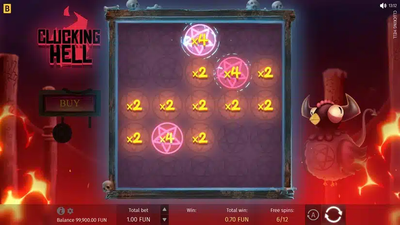 Clucking Hell also offers exciting opportunities for free spins. By landing four or more scatter symbols, players can trigger between 10 and 15 free spins, accompanied by persistent multipliers that increase the potential rewards with each spin. For those eager to jump straight into the action, the Bonus Buy option allows instant access to the free spins feature at a cost of 100× your bet, while maintaining a balanced RTP of 96.23%.