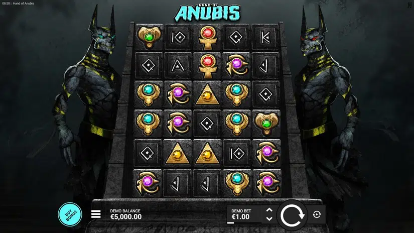 Once you're in the game, success hinges on understanding its key mechanics. Hand of Anubis unfolds on a 5x6 grid and utilizes a cluster pays system rather than traditional paylines. Winning clusters disappear to make way for new symbols, enabling chain reactions on a single spin.