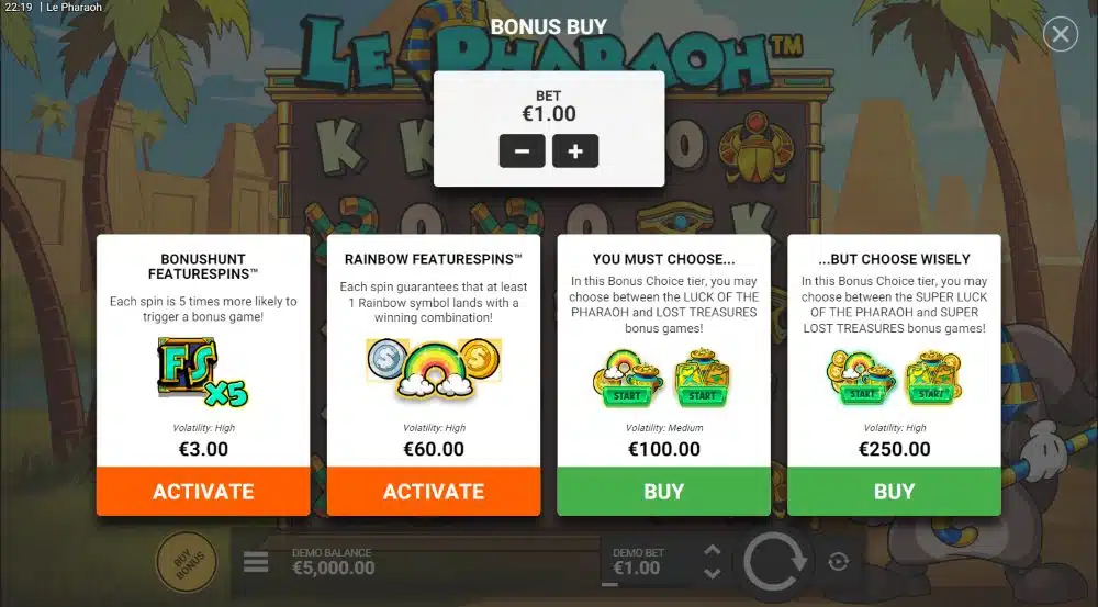 In the vibrant world of Le Pharaoh, players can enjoy a range of special features that make playing Le Pharaoh online both exciting and potentially rewarding. At the heart of the gameplay is the Bonus Choice menu, where different free spin modes can be activated for varied strategies and win potential. The Luck of the Pharaoh mode awards 10 free spins with Sticky Re-Drops and Golden Riches, triggered by three FS scatters. Extra scatters add more spins, extending the action. Super Luck of the Pharaoh offers 12 free spins with higher-value coins, making every Golden Riches activation more lucrative.