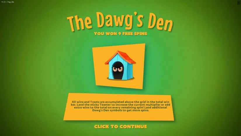 Another major feature is Dawg’s Den, activated by landing three Dawg’s Den scatter symbols. Players receive 5 initial free spins, during which multipliers accumulate. At the end of the round, all collected multipliers are applied in a final payout spin, creating the potential for substantial rewards.