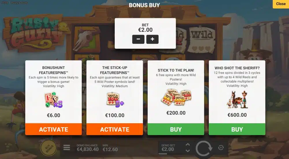 Yes, Rusty & Curly offers Bonus Buy options for several features, though Wild Drop Spins cannot be purchased to maintain their exclusivity.